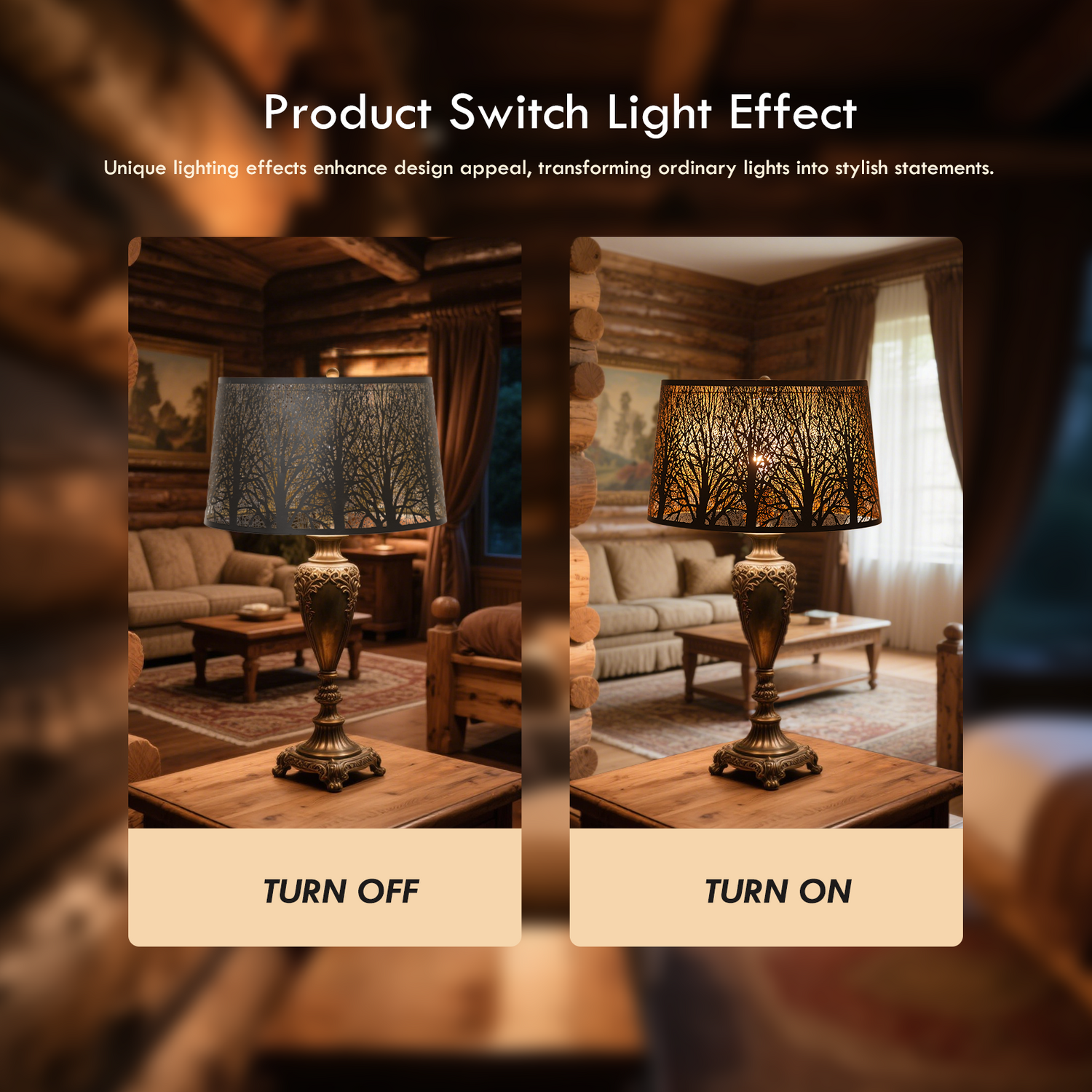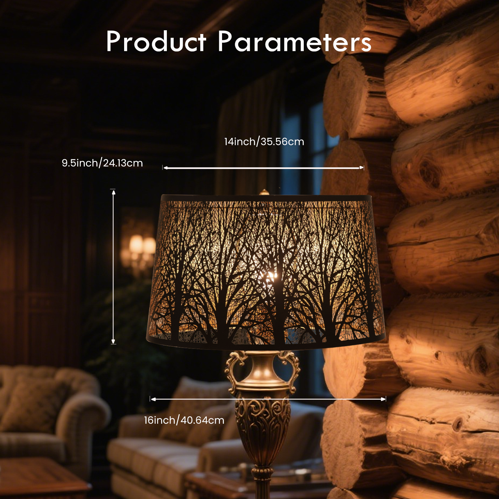 When illuminated, the gold lining amplifies the light, casting warm, golden tones through the tree patterns and filling the room with a rich, inviting glow.