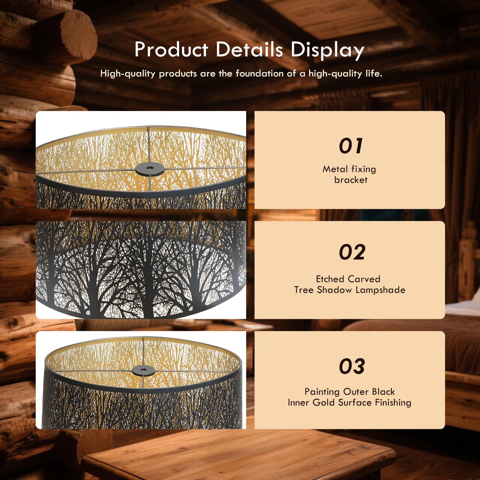 This oversized drum-shaped shade pairs a black exterior with a golden interior, carved all around with a forest design.